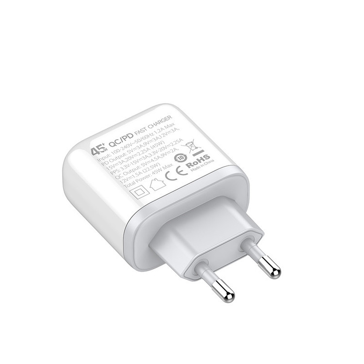 دارای کابل دوسر Type-c قدرت خروجی ۴۵ وات ظرفیت خروجی: Type-c: ۵V/۳A, ۹V/۳A, ۱۲V/۳A, ۱۵V/۳A, ۲۰V/۲.۲۵A USB-A: ۵V/۴.۵A, ۹V/۲A, ۱۲V/۱.۵A دارای استاندارد QC نسخه ۳.۰ دارای قابلیت شارژ سریع PD