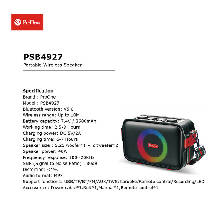 همیشه جای یک موسیقی در مسافرت،طبیعت گردی و دورهمیهای دوستانه خالی است به همین دلیل اکثریت افراد با خرید اسپیکرهای بلوتوثی قابل حمل، کار خود را راحت میکند تا همیشه موسیقی در هر محفلی پابرجا باشد. همچنین با افزایش علاقهمندی مصرف کنندگان به کالاهای صوتی، اسپیکرها با مدلها و قابلیتهای متنوعی تولید شدهاند. برند پرووان، یکی از پیشتازان تولید لوازم جانبی دیجیتال، با بررسی نیاز مردم نسبت به طراحی و تولید اسپیکر بلوتوثی قابل حمل PSB4927 اقدام کرده است . این اسپیکر با ابعادی معادل طول 265، عرض110و ارتفاع 165میلی متر طراحی و تولید شده است و وزن کل اسپیکر معادل 2300گرم است. در قسمت بالای اسپیکر PSB4927 یک پنل کاربردی جهت قطع و وصل کردن، عقب و جلو زدن موسیقی، تغییر حالات پخش و دکمه روشن و خاموش قرار دارد. این اسپیکر دارای رادیو و میکروفون داخلی است که درصورت اتصال کارت حافظه صدای محیط را ظبط میکند.و محفظههای پورتهای اتصال USB، جک 3.5 میلیمتری صدا، شیار کارت حافظه و ورودی شارژ اسپیکر قرار دارد. قدرت این اسپیکر در مجموع 40 وات بوده و دارای باتری 3600 میلی آمپر است که بطور نرمال 3 ساعت زمان پخش موسیقی دارد و مدت زمان شارژ آن 6 ساعت است. اسپیکر زیبا و جذاب PSB4927 دارای رقص نور رنگی است که با آهنگ تم رنگی جذابی را به تصویر میکشد.ضمنا این اسپیکر پرکاربرد دارای یک بند همراه برای حمل ونقل راحت تر است.