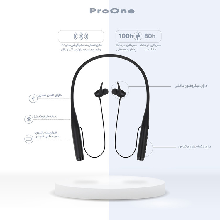 | هندزفری بلوتوث گردنی، دارای باتری 800میلی آمپری ، مدت زمان پخش موسیقی و مکالمه حدود 100ساعت ، مدت زمان شارژ حدود 1/5ساعت ، دارای میکروفن قوی ، دارای سری های مگنتی ،دارای قابلیت مگنت فعال جهت قطع موزیک و مکالمه ، دارای کابل تایپ سی برای شارژ |