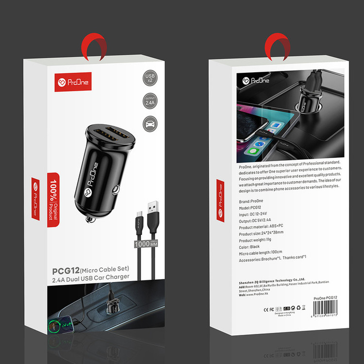پرووان، شارژر فندکی مدل PCG12 را در طراحی زیبا و ابعاد کوچک با بدنه ای از جنس پلاستیک ABS و پلی کربنات ضد حرارت ساخته که از مقاومت مناسبی در برابر ضربه، فشار و گرما برخوردار می باشد. بر روی این فندکی دو پورت USB 2.0 قرار دارد که با حداکثر شدت جریان خروجی 2٫4 آمپر و ولتاژ خروجی 5 ولت توانایی شارژ همزمان دو دستگاه مختلف را با سرعت نسبتا بالا امکانپذیر می کند. ولتاژ ورودی این محصول برابر با 12 تا 24 ولت تعیین شده که برای استفاده در خودروها مناسب است و همچنین با تنظیم میزان شدت جریان عبوری و ولتاژ متناسب با نوع دستگاه متصل، عملیات شارژ ایمن را انجام می دهد و از باتری دستگاه در برابر نوسانات جریانی، اتصالات کوتاه و افزایش دما محافظت می نماید. همچنین همراه این فندکی ProOne یک کابل میکرو یو اس بی به طول 100 سانتی متر و جنس باکیفیت نیز وجود دارد.