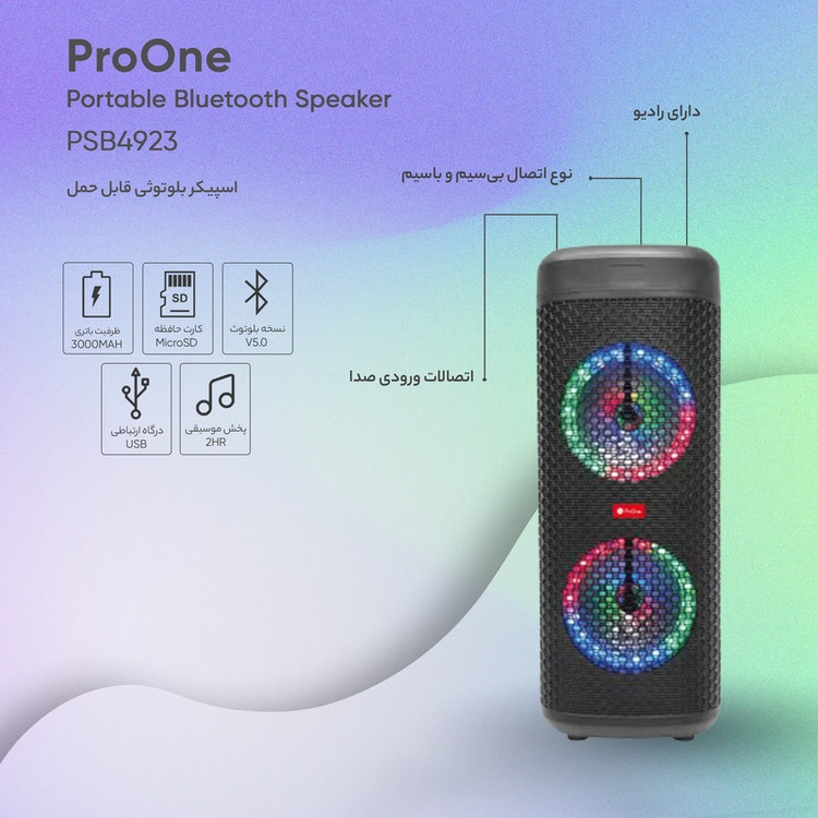 اسپیکر پرووان مدل PSB4923 محصولی جدید از شرکت «پرووان» است که دارای 2 بوفر 8 اینچی می باشد که به واسطه توان خروجی بالا؛ صدای پرقدرت و شفافی را برای برگزاری مهمانیها و مجالس ایجاد میکند. علاوه بر حجم زیاد صدای خروجی، طراحی زیبا، افکتهای متنوع نورانی و قابل حمل بودن؛ این محصول را به یکی از اسپیکرهای جذاب موجود در بازار تبدیل کرده است. این اسپیکر از طریق فناوری بلوتوث، پورت USB وخروجی AUX و مموری کارت به تلفنهمراه یا پخشکنندههای مختلف صوتي متصل میشود. اسپیکر پرووان PSB4923 پرووان انرژی مورد نیاز خود را از طریق یک باتری داخلی لیتیوم یونی پر قدرت با ظرفیت 3000 میلی آمپر ساعت تامین میکند که برای پخش موسیقی حدود 2 ساعت جوابگو است. شارژ شدن کامل این محصول تنها 4 ساعت زمان میبرد که با توجه به ظرفیت آن، زمان نسبتا مناسبی است. توسط بلوتوث یا همان قابلیت TWS میتوانید دو دستگاه PSB4923 را به طور همزمان به یکدیگر متصل کنید؛ همچنین این محصول دارای ورودیهای مجزا برای میکروفون و گیتار بوده که همه چیز را برای یک اجرای حرفهای فراهم میکند. اسپیکر پرووان PSB4923 قابلیت کاراکوئه دارد که توسط آن میتوانید روی صدای خواننده همزمان با صدای خود خوانندگی کنید.