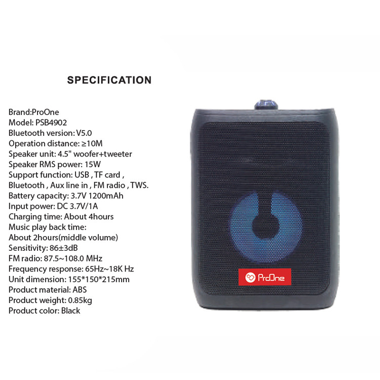 اسپیکر پرووان مدل PSB4902 محصولی از شرکت «پرووان» است که دارای سابوفر 4.5 اینچ است و به واسطه توان خروجی بالا؛ صدای پرقدرت و شفافی را برای برگزاری مهمانیها و مجالس ایجاد میکند. علاوه بر حجم زیاد صدای خروجی، طراحی زیبا، افکتهای متنوع نورانی و قابل حمل بودن؛ این محصول را به یکی از اسپیکرهای جذاب موجود در بازار تبدیل کرده است. این اسپیکر از طریق فناوری بلوتوث، پورت USB وخروجی AUX و مموری کارت به تلفنهمراه یا پخشکنندههای مختلف صوتي متصل میشود. اسپیکر پرووان PSB4902 پرووان انرژی مورد نیاز خود را از طریق یک باتری داخلی پر قدرت با ظرفیت 1200 میلی آمپر ساعت تامین میکند که برای پخش موسیقی به مدت 2 ساعت جوابگو است. شارژ شدن کامل این محصول تنها 4 ساعت زمان میبرد که با توجه به ظرفیت آن، زمان نسبتا مناسبی است. توسط بلوتوث یا همان قابلیت TWS میتوانید دو دستگاه PSB4902 را به طور همزمان به یکدیگر متصل کنید؛ همچنین این محصول دارای ورودیهای مجزا برای میکروفون بوده که همه چیز را برای یک اجرای حرفهای فراهم میکند.