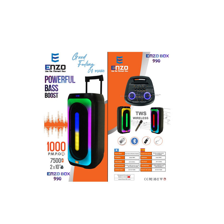 اسپیکر پارتی باکس 990 طراحی شده در شرکت ENZO میباشد. این اسپیکر با کیفیت بالای بدنه و صدای شفاف و قدرتمند باعث جذابیت در آن شده. LED های RGB این دستگاه جلوه زیبایی به مراسم های شما میدهد و شما میتوانید از میکروفن آن به صورت بی سیم استفاده کنید و دارای قابلیت TWS (شما میتوانید همزمان دو اسپیکر PARTY BOX 990 را بهم متصل کنید و به آن متصل شید و صدای موزیک را از هر دو اسپیکر بشنوید) میباشد.ظرفیت باتری این اسپیکر 7500mah میباشد. شما میتوانید از طریق TF-CARD MICROPHON AUX GUITAR INPUT USB BLUTOOTH به دستگاه متصل شوید و از پخش صدای آن لذت ببرید.این اسپیکر دو ساب 10 اینچ میباشد و با ابعاد 380x380x780 و وزن 11.8kg ساخته شده است و دارای کنترل از راه دور دفترچه راهنما آداپتور هولدر نگه دارنده میکروفن میباشد. توان خروجی کلی این اسپیکر 1000w و توان خروجی واقعی آن 100w میباشد. محصولات انزو به صورت کاملا قانونی و دارای لیبل شناسه کالا از وزارت سمت و همچنین مورد تایید استاندارد ملی میباشد.امیدواریم از شنیدن موسیقی با محصولات انزو نهایت لذت را ببرید.