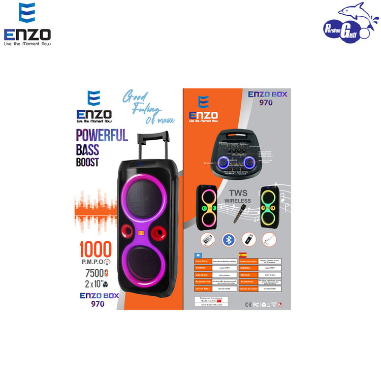 اسپیکر پارتی باکس 970 طراحی شده در شرکت ENZO میباشد. این اسپیکر با کیفیت بالای بدنه و صدای شفاف و قدرتمند باعث جذابیت در آن شده. LED های RGB این دستگاه جلوه زیبایی به مراسم های شما میدهد و شما میتوانید از میکروفن آن به صورت بی سیم استفاده کنید و دارای قابلیت TWS (شما میتوانید همزمان دو اسپیکر PARTY BOX 970 را بهم متصل کنید و به آن متصل شید و صدای موزیک را از هر دو اسپیکر بشنوید) میباشد.ظرفیت باتری این اسپیکر 7500mah میباشد. شما میتوانید از طریق TF-CARD MICROPHON AUX GUITAR INPUT USB BLUTOOTH به دستگاه متصل شوید و از پخش صدای آن لذت ببرید.این اسپیکر دو ساب 10 اینچ میباشد و با ابعاد 380x380x780 و وزن 11.8kg ساخته شده است و دارای کنترل از راه دور دفترچه راهنما آداپتور هولدر نگه دارنده میکروفن میباشد. توان خروجی کلی این اسپیکر 1000w و توان خروجی واقعی آن 100w میباشد. محصولات انزو به صورت کاملا قانونی و دارای لیبل شناسه کالا از وزارت سمت و همچنین مورد تایید استاندارد ملی میباشد.امیدواریم از شنیدن موسیقی با محصولات انزو نهایت لذت را ببرید.