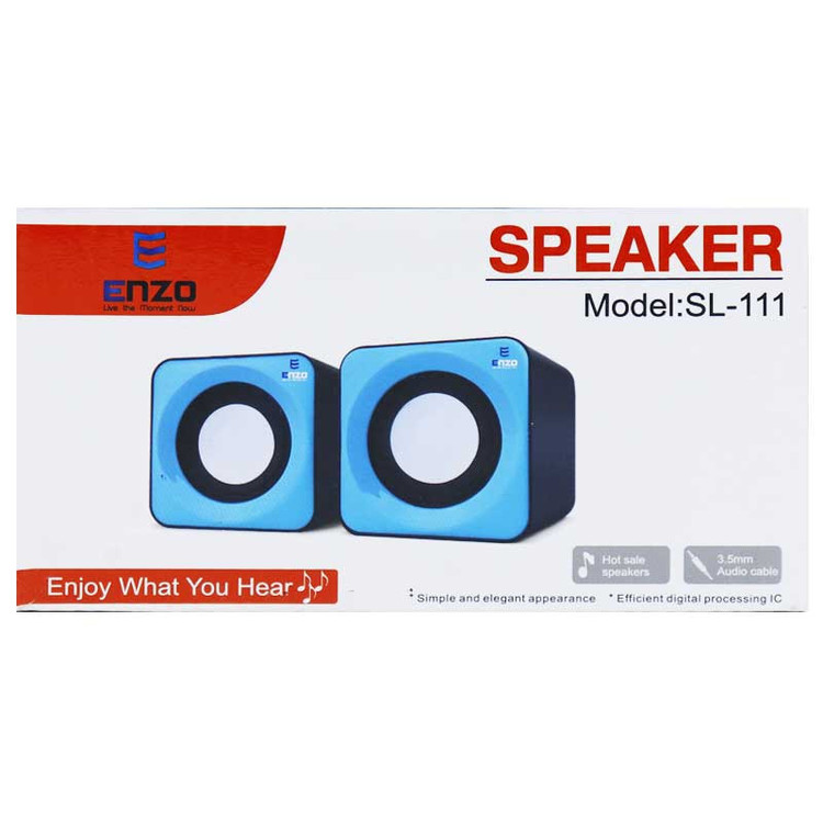 اسپیکر «SL-111» از سری اسپیکرهای رومیزی شرکت «انزو» (Enzo) است. این اسپیکر از طریق کابل AUX به کامپیوتر ، لپتاپ ، موبایل و کلیه تجهیزاتی که از خروجی جک 3.5 میلی متری صدا پشتیبانی می کنند متصل شده و کاربر را در پخش موسیقی همراهی میکند. درگاههای خروجی این محصول شامل یک پورت AUX و کابل USB است که اتصال USB صرفاً برای تامین برق اسپیکر ها میباشد. در قسمت پشت اسپیکر ولوم مکانیکی تعبیه شده که میتوانید میزان صدا را به دلخواه کم و زیاد کنید. این محصول شرکت انزو 3.5 وات توان خروجی را در اختیار شما قرار می دهد که برای اسپیکری با این ابعاد مطلوب به نظر میرسد. اسپیکر SL-111 از دو قسمت تشکیل شده است. این اسپیکر میتواند برای استفادههای غیرحرفهای مثل گوش دادن به موسیقی ، مشاهده فیلم ، شنیدن پادکست ها گزینهی مناسبی باشد.