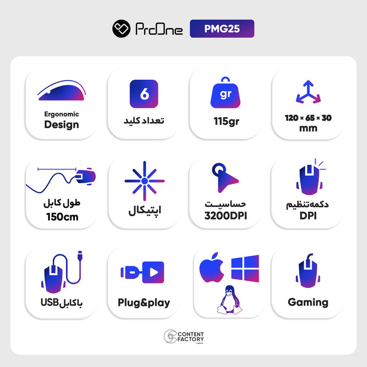 ماوس را باید عصای دستی دانست که اگر نباشد تقریباً استفاده از کامپیوتر را ناممکن و استفاده از لپتاپ را دشوار میکند. به همین دلیل خرید یک ماوس با کیفیت که طراحی استاندارد و راحتی دارد، بسیار مهم است. در بازار برندهای زیادی وجود دارد که اگر به دنبال خرید یک محصول مرغوب اما مقرونبهصرفه هستید؛ ما به شما ماوسهای برند پرووان را پیشنهاد میکنیم. پرووان یکی از برندهای بسیارحرفهای در زمینه تولید محصولاتی نظیر ماوس و کیبورد به ویژه محصولات تخصصی گیمینگ است. ماوس مخصوص بازی پرووان مدل PMG20 با حفظ ظاهر خاص، برای هر گیمری جذاب خواهد بود. استفاده از رقص نور و شب رنگ جلوه بینظیری به ماوس بخشیده است. نوع اتصال این مدل به صورت با سیم که به طول 1.5 متر است. تعداد کلیکهای این ماوس 6 عدد است که قابلیت 2.000.000 بار کلیک را دارد.دقت این ماوس 800-3200 dpi می باشد.سطح زیرین ماوس کمترین اصطکاک را دارد لذا ماوس بسیار راحت جابجا میشود.ارگونومی بسیار خوب نیز در کنار دیگر خصوصیات باعث راحتی در استفاده و لذت بردن از کار با آن میشود و استفاده طولانی مدت بدون خستگی این موس را به یک موس حرفه ای جهت بازی کردن و گیمینگ و کار طراحی میباشد.