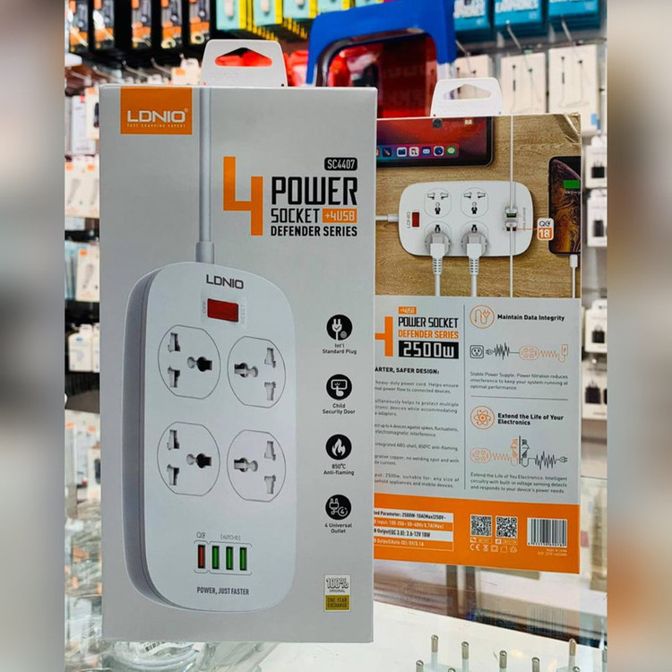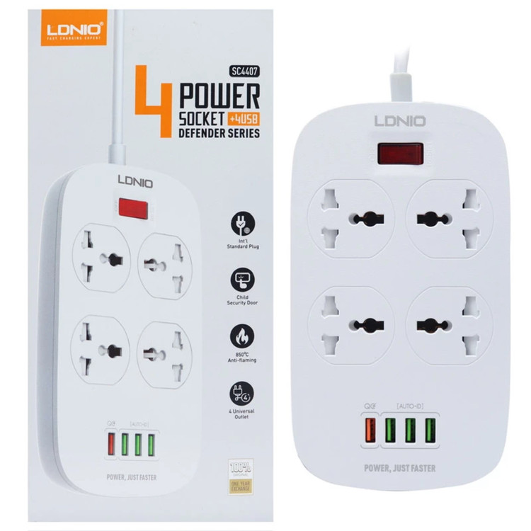 چند راهی برق مدل SC4407 یکی از تولیدات برند LDNIO می باشد که برای آن چهار پورت USB نیز طراحی شده است. این چند راهی قابلیت اتصال 4 عدد دو شاخه و سه شاخه های مختلف را داشته و در مقابل حرارت تا 850 درجه سلسیوس مقاوم است. کابل این محصول 200 سانتی متر بوده و برای استفاده روزمره مناسب است. شدت جریان انتقالی این محصول 10 آمپر بوده و توان خروجی آن 2500 وات است. این محصول از تکنولوژی Auto-ID پشتیبانی می کند که از شارژ شدن بیش از حد جلوگیری خواهد کرد و دارای محافظ کودک نیز می باشد. شدت جریان و ولتاژ خروجی کلی از پورت های USB این محصول به ترتیب 3٫1 آمپر و 5 ولت می باشد. یکی از پورت های این محصول از فناوری QC3.0 پشتیبانی می کند و توان و ولتاژ خروجی از آن به ترتیب 18 وات و 3٫6-12 ولت می باشد. 4 عدد پورت USB که برای این محصول قرار داده شده این امکان را به شما خواهد داد تا چهار گوشی را به صورت جداگانه شارژ کنید.