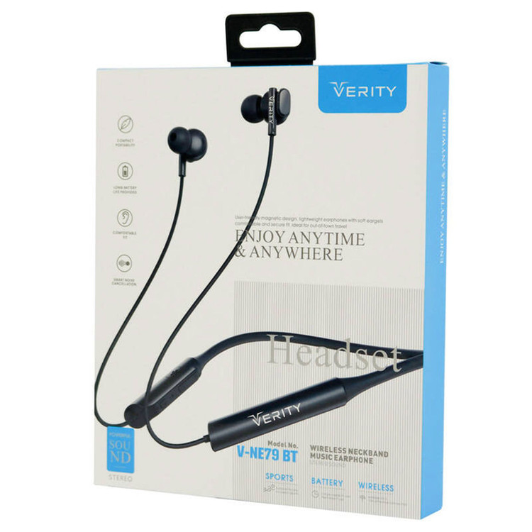 هدفون بلوتوث گردنی Verity مدل V-NE79BT با طراحی زیبا و خاص جهت فعالیت های ورزشی، دویدن، پیاده روی یا هنگام رانندگی یا کاربری های روزانه که در هر مکان آهنگ های مورد علاقه خود گوش و با دوستان خود در تماس باشید. این مدل توسط یک نگهدارنده خمیده پلاستیکی به شکل u به دور گردن می افتد و سرگوش ها توسط کابل نازکی به پنل گردنی متصل شده و با خاصیت مگنتی خود میتوانید آنها در صورت عدم استفاده از گوش خارج کرده و به دور گردن رها کنید تا با جدب خودکار از برخورد آنها به همدیگر در هنگام راه رفتن یا دویدن جلوگیری شود. ساختار ارگونومی و استاندارد با وزنی بسیار سبک و منعطف که با قرار گیری بر روی گردن بهقدری سبک است که احساس هیچگونه خستگی در دراز مدت نمیکنید. همچنین برای مدیریت موزیک و تماس ها بر روی لبه سمت راستی پنل سه دکمه تعبیه شده است تا برای کنترل صدا دو دکمه مثبت و منفی و یک کلید پاسخ گویی به مکالمات برای دسترسی راحتتر طراحی شده است. از مشخصات فنی که در مورد این هندزفری گردنی وریتی میتوان به آن اشاره کرد وجود دو درایور کوچک قدرتمند با قابلیت حذف نویز و کاهش افت کیفیت صدا و حفظ جزئیات بیشتر موسیقی بصورت استریو بسیار پایدار توسط نسخه بلوتوث با ورژن 5.0 و محدوده برد تا 10 متر قابل اتصال به انواع گوشی های هوشمنداست. همچنین دامنه فرکانس 20Hz~20KHz، پشتیبانی از استاندارهای صوتی مثل HSP/HFP/A2DP/AVRCP را نیز دارد. منبع تغذیه این هدفون بلوتوث گردنی Verity مدل V-NE79BT یک باطری لیتیوم داخلی با ظرفیت 110 میلی آمپر قابلیت شارژ توسط کابل شارژ میکرو USB که به همراه محصول ارائه شده را دارد. با هر بار شارژ 1.5 ساعته میتوان تا 15 ساعت به مکالمه و 12 ساعت به موزیک مورد علاقه خود گوش کرد.