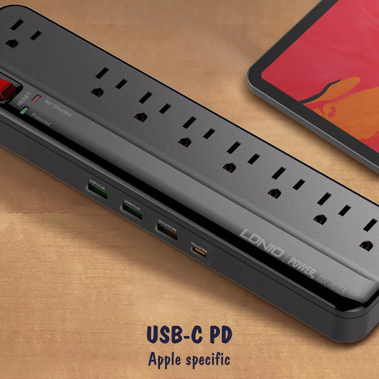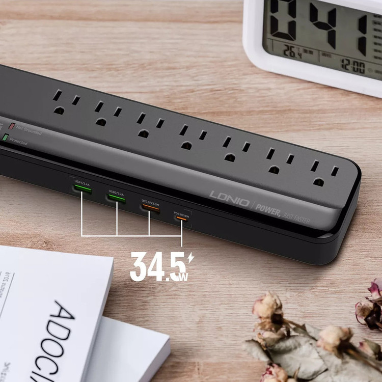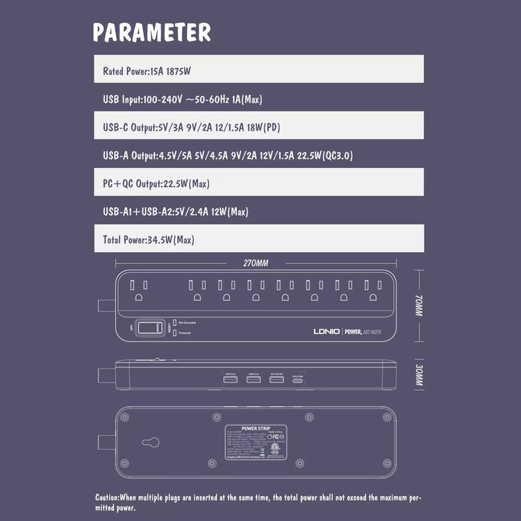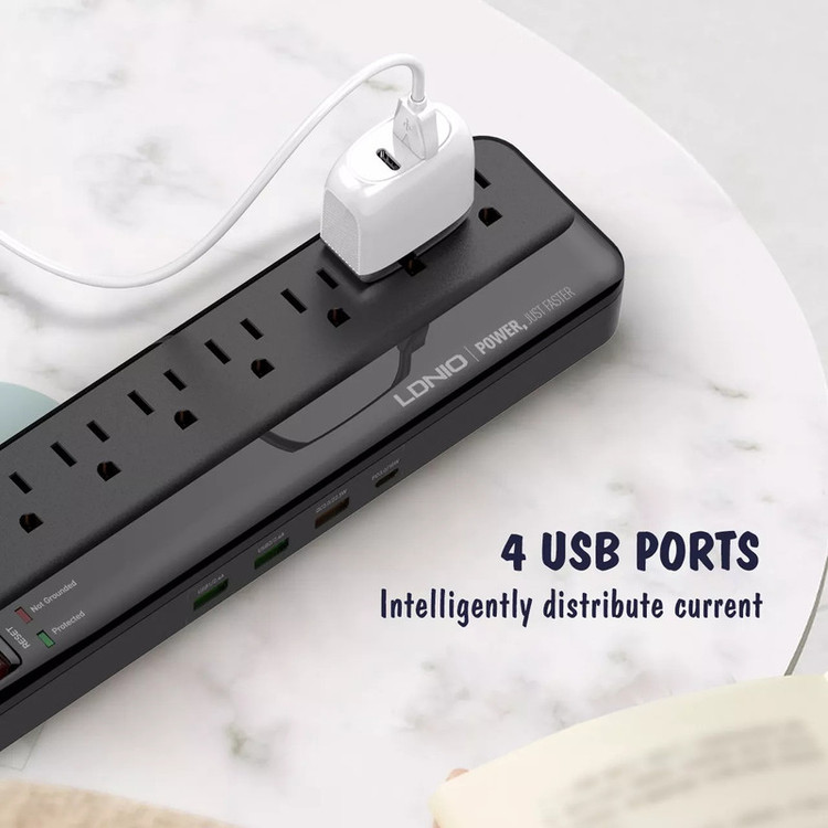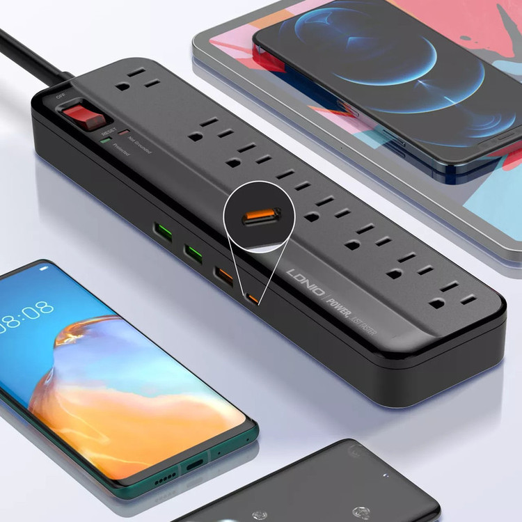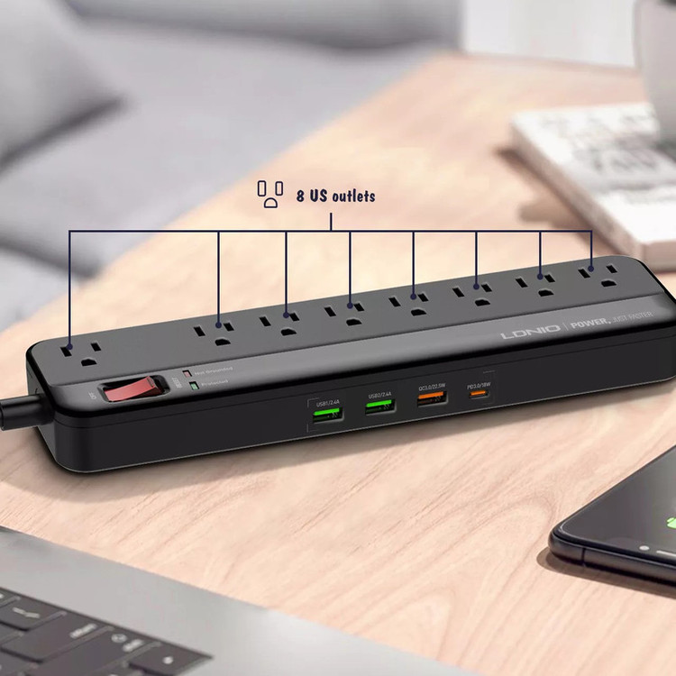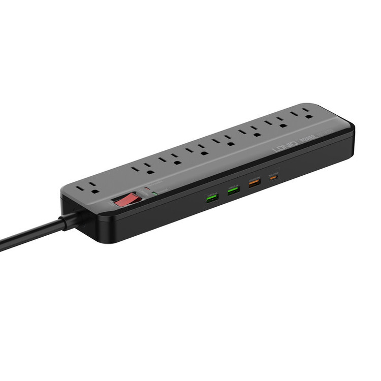 چند راهی برق LDNIO SU8440 با 8 خروجی برق US (استاندارد دو شاخه آمریکا)، 3 خروجی USB-A و یک خروجی USB-C نیازهای مختلف شما را به منبع انرژی مرتفع میکند و دیگر نگران کمبود پریز نباشید. خروجی USB-A این چندراهی از پروتکلهای مختلف شارژ سریع نظیر QC 3.0، PD 3.0، SCP، VOOS، AFC، FCP و Auto ID پشتیبانی میکند و در پورت USB-C قابلیت پشتیبانی از شارژ سریع PD برای دستگاه های Apple نیز دارد. پورت های USB این دستگاه از چیپ هوشمندی بهره میبرند که میتواند به طور خودکار دستگاهی که به آن متصل میشود را شناسایی کند و آمپر متناسب با آن را به کار برد. این فناوری با عنوان Auto-ID مشخص شده و نام دارد. چند راهی برق LDNIO SU8440 جریان را به صورت هوشمند بین پورتهای متخلف تقسیم میکند و تا 12 دستگاه را میتوان به صورت همزمان به آن متصل نمود. البته این را در نظر داشته باشید که در این صورت توان هر خروجی کاهش خواهد یافت. جنس بدنه این محصول نسوز است و قابلیت تحمل دمای 850 درجه سانتی گراد را دارد. باید به این مورد نیز اشاره کرد که پریزها دارای محافظ کودک نیز هستند. همچنین دارای محافظت از نوسانات برق و تداخل الکترومغناطیس میباشد. چندراهی USB دار LDNIO SU8440 دارای طراحی یکپارچه است و از مس مرغوب که تا 33 درصد ضخیم شده در ساخت کابل آن استفاده شده است که باعث مقاومت کمتر و هدایت ایمن تر جریان برق میشود. طول سیم آن 2 متر میباشد. توان کلی این محصول 2500 وات و شدت جریان کلی آن 15 آمپر میباشد. ولتاژ ورودی برابر 240-100 ولت است. توان خروجی پورت USB-A آن 22.5 وات شامل 4.5V/5A ،5V/4.5A ،9V/2A و 12V/1.5A (حداکثر 22.5W) میباشد که از شارژ سریع QC 3.0 پشتیبانی میکند. پورت USB-C با حداکثر توان 18 وات از PD پشتیبانی میکند و دارای خروجی 5V/3A ،9V/2A و 12V/2.5A میباشد. خروجی PC+QC برابر 22.5W و USB-A1+USB-A2 برابر 2.5V/2.4A و 12W میباشد. توان کلی پورتهای USB در کل 34.5W میباشد.