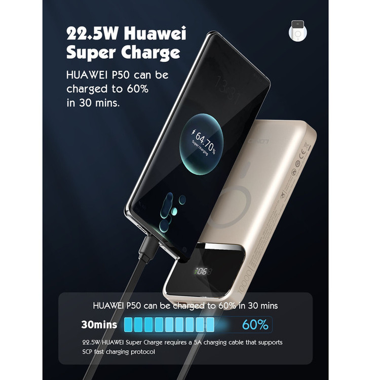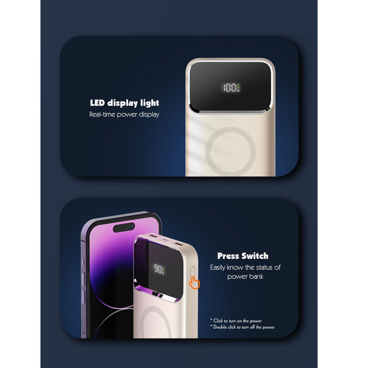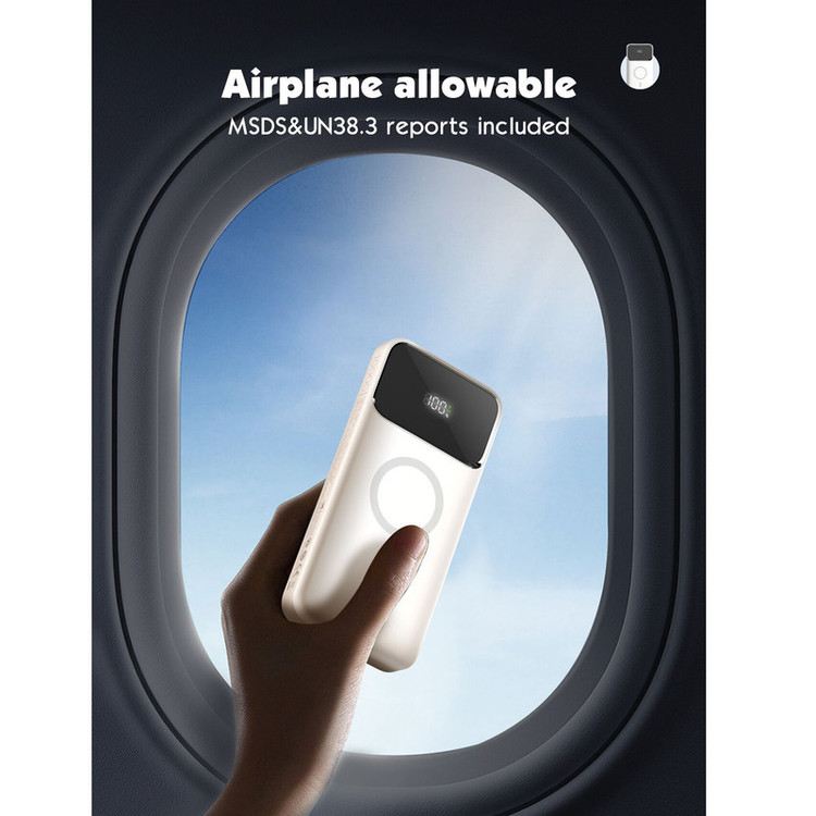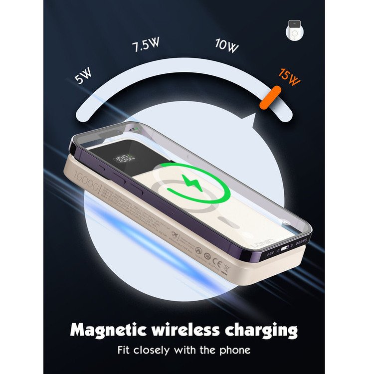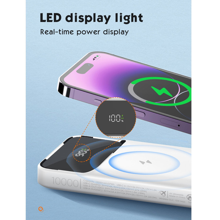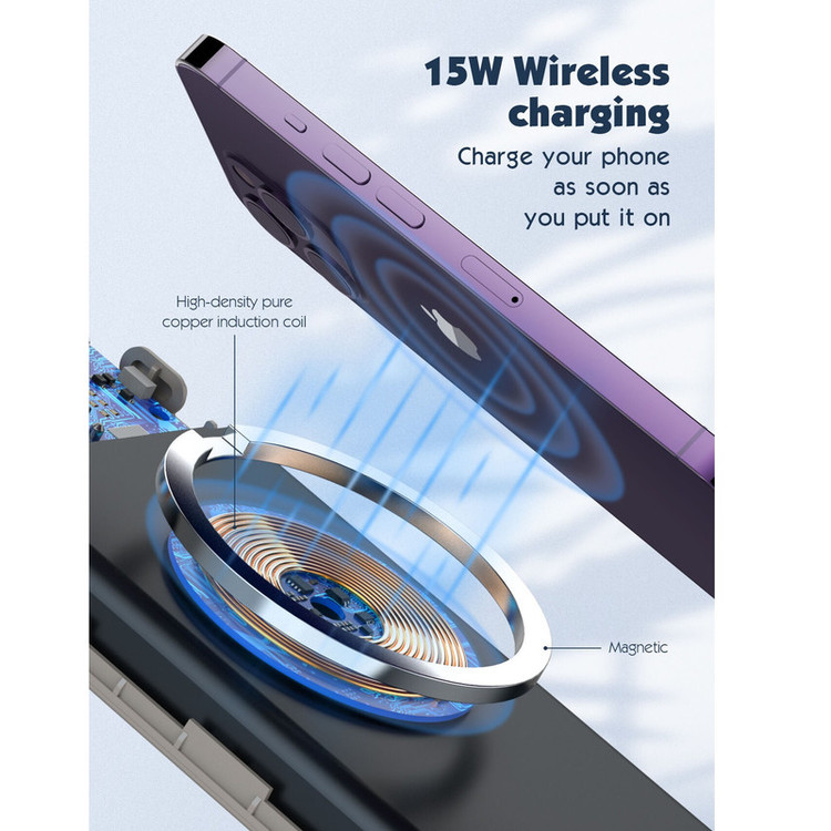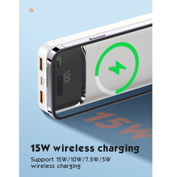 تکنولوژی فست شارژ PD و QC دارای قابلیت حمل در هواپیما شارژ وایرلس مگنتی 15 واتی دارای 3 پورت خروجی + پد شارژ وایرلس توان خروجی کلی 22.5 وات نمایشگر LED برای باتری