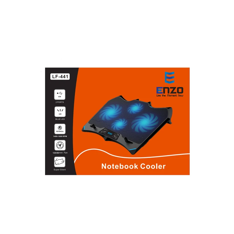پایه ی خنک کننده و نگهدارنده لپ تاپ ENZO LF-441 در ابعاد جمع و جور مناسب لپ تاپ های تا 17 اینچ طراحی شده است. دارای چهار عدد فن است که دارای قابلیت نورپردازی LED می باشد. جنس بدنه این محصول از فلز آلومینیوم و پلاستیک ABS می باشد که از انتقال حرارت و مقاومت خوبی برای استفاده برخوردار است. همچنین پایه ی خنک کننده ENZO LF-441 قابلیت تغییر و تنظیم ارتفاع در دو حالت مختلف را دارد که می تواند برای استفاده های مختلف بسیار مناسب باشد. ENZO LF-441 دارای دو گیره در قسمت جلویی محصول برای جلوگیری از سر خوردن لپ تاپ می باشد.