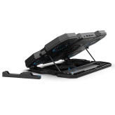 گرما میتواند عملکرد دستگاه شما را تحت تأثیر قرار دهد. پایه خنک کننده لپ تاپ انزو مدل LF-553 با طراحی منحصر به فرد و ویژگیهای متنوع خود، به عنوان یک پایه خنک کننده لپتاپ، راهحلی کارآمد برای حل این مشکل است. این پایه خنک کننده مجهز به پنج عدد فن با عملکرد بسیار کم صدا می باشند. ابعاد فن ها یک عدد 10 میلیمتری و چهار عدد 70 میلیمتری بوده که دارای نورپردازی LED می باشند. جنس بدنه این محصول ترکیبی از پلاستیک فشرده و فلز بوده که مقاومت بالایی در فشار و ضربات احتمالی دارد. این محصول مناسب لپ تاپ هایی در محدوده سایز 9 الی 17 اینچ می باشد. این پایه خنک کننده مجهز به دو درگاه یو اس بی بوده و قابلیت تنظیم ارتفاع در چند سطح مختلف را دارد. همچنین دارای پایه نگهدارنده لپ تاپ جهت جلوگیری از سر خوردن لپ تاپ می باشد. طراحی این محصول به گونه ای است که ضخامت آن فقط 3 سانتیمتر بوده و به راحتی در کیف لپ تاپ قابل حمل می باشد. همچنین این محصول دارای محفظه نگهدارنده گوشی موبایل بوده که هم محیط کاری شما را زیباتر میکند و هم دسترسی به گوشی موبایل را برای شما راحت تر خواهد کرد.