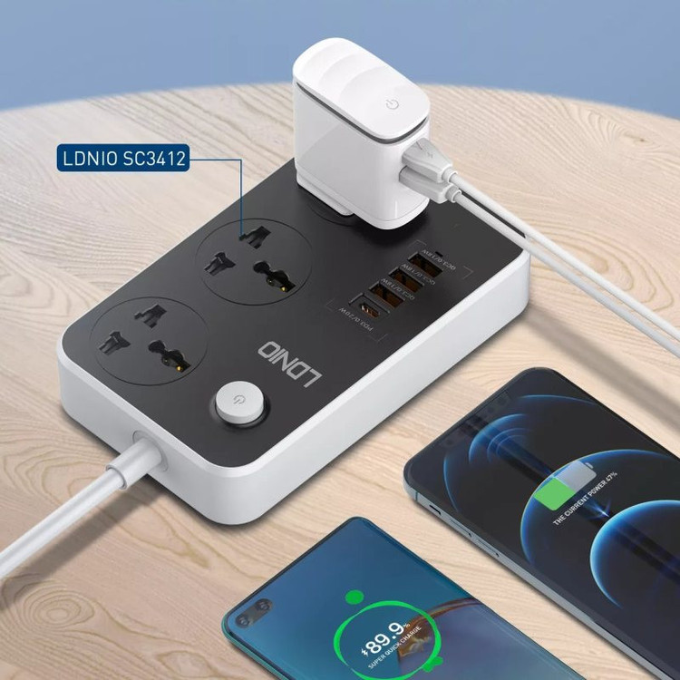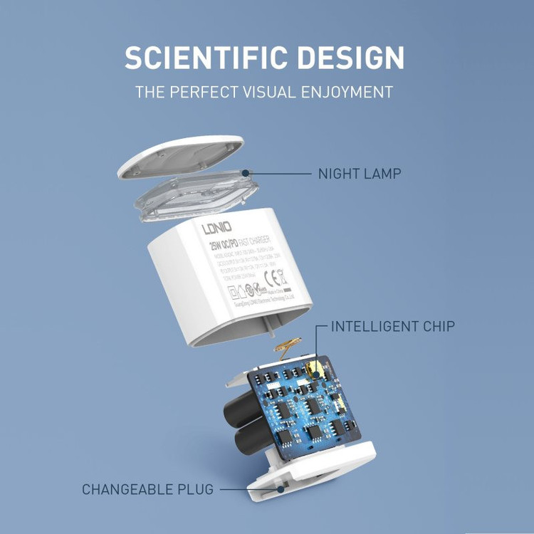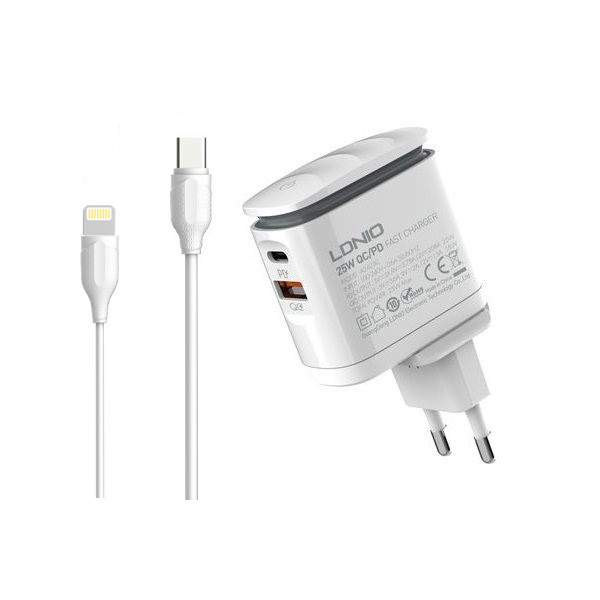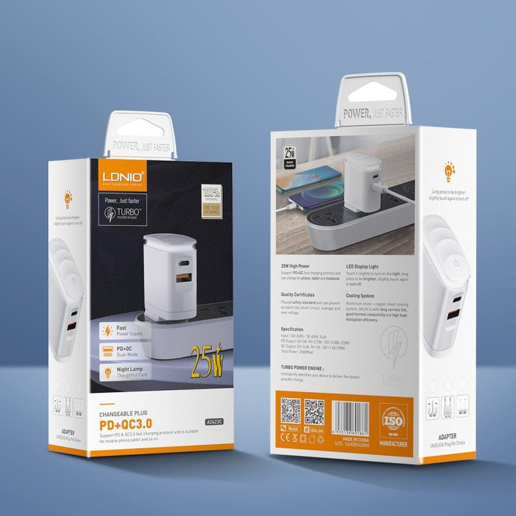 شارژر دیواری LDNIO A2423C از پروتکلهای شارژ سریع پشتیبانی میکند. این شارژر دارای یک پورت USB-A با قابلیت شارژ سریع QC 3.0 و یک پورت USB-C با قابلیت شارژ سریع PD میباشد. همچنین از پروتکلهای مختلف شارژ مثل SCP، FCP، VOOC و PE نیز پشتیبانی میکند. توان شارژ آن برای خروجی تایپ C حداکثر 25W به مشخصات 5V/3A ،9V/2.78A و 12V/2.08A میباشد. توان شارژ خروجی USB-A حداکثر 18W به مشخصات 5V/3A ،9V/2A و 12V/1.5A میباشد. توان کلی دستگاه در حالت کلی 25w است. ولتاژ ورودی برای شارژر LDNIO A2423C PD QC 3.0 بین 100 تا 240 ولت است که برای استفاده در کشورهای مختلف مناسب است. یکی از ویژگیهای خاص LDNIO A2423C داشتن چراغ LED روی لبه بدنه میباشد که میتوان آن را به صورت لمسی روشن خاموش کرد. همچنین با نگاه داشتن انگشت خود روی کلید لمسی آن می توانید شدت نور آن را تنظیم کنید. شارژر LDNIO A2423C Fast Charge محافظت 9 لایهای ارائه میدهد تا با خیال آسوده از آن استفاده کنید. در برابر توان، دما، ولتاژ، جریان و شارژ بیش از اندازه از گوشی شما محافظت میکند. همچنین جلوی اتصال کوتاه را میگیرد و جرقه نمیزند. علاوه بر این ها جنس آن از PC نسوز میباشد که تا 850 درجه سانتی گراد مقاومت دارد. این شارژر دارای کابل همراه type-c به lightning داخل پک می باشد.