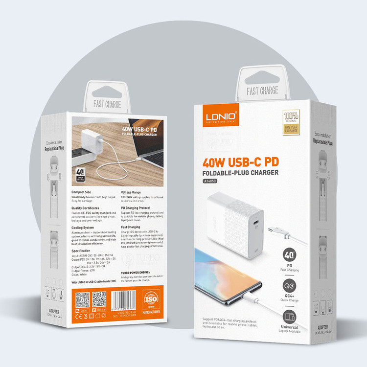 فست شارژر یکی از رقابتی ترین محصولات دیجیتال این دوره میباشد. از آن جایی که اکثر گوشیهای پرچمدار از شارژ سریع پشتیبانی میکنند کمپانیها نیز در تلاش برای طراحی بهینهترین شارژر میباشند. پشتیبانی از قابلیت فست شارژ خصوصا استانداردهای Qualcomm سبب میشود تا باتری دوام بیشتری داشته باشد. آداپتور شارژ سریع LDNIO A1405C دارای 1 پورت USB Type C است که از پروتکل PD پشتیبانی میکند. درگاه شارژ سریع آداپتور شارژر الدینیو A1405C دارای توان 40W بوده و ولتاژ ورودی آن برابر با 100-240V است. روی بدنه این شارژر یک پورت تایپ سی وجود دارد که از قابلیت فست شارژ Qualcomm نسخه 4 یا QC4.0 پشتیبانی میکند. این درگاه دارای پروتکل PD نیز میباشد و لذا شما میتوانید تبلت و لپ تاپ خود را نیز با آن شارژ کنید. کابل تایپ سی به تایپ سی درون پکیج این شارژر خصوصا مناسب شارژ بعضی از مک بوک های قدیمی تر اپل میباشد. به علاوه با خرید یک کابل تایپ سی به لایتنینگ میتوانید آیپد پرو، آیفون 8 و بعضی دیگر از محصولات جدیدتر آیفون را شارژ کنید. همانطور که گفتیم توان حداکثر این آداپتور فست شارژ 40 وات است، اما همه گوشیها نمیتوانند این توان را تحمل کنند و تنها گوشیهایی که از QC4.0 پشتیبانی کنند امکان بهرهمند شدن از شارژ سریع را خواهند داشت. برای جلوگیری از ورود جریان بیش از حد به گوشیهایی که تحمل توان بالا را ندارند قابلیت Auto ID تعریف شده که تشخیص میدهد هر گوشی تا چه میزان جریان ورودی نیاز دارد و طبق آن باتری را شارژ میکند. سر دو شاخه شارژر فست شارژ الدینیو A1405C از متریال مس و نیکل ساخته شده که رسانایی الکتریکی مطلوبی دارند. بدنه اصلی نیز کوچک است ,و از پلی کربنات ضد حریق درجه V0 ساخته شده و به لطف فناوری اولتراسونیک طراحی، در مقابل ضربه و افتادن مقاوم است. برای جلوگیری از مواجهه با جریان و ولتاژ زیاد و اتصال کوتاه، این دستگاه از استانداردهای ایمنی مربوطه برخوردار گشته است. سری های شارژر معمولا در اثر عملکرد بالا گرم میشود. برای جلوگیری از داغ شدن آداپتور الدینیو A1405C ترکیبی از ورق آلومینیومی و مسی در آن به کار رفته است. این ورقها به دلیل رسانایی گرمای بالایی که دارند از داغ شدن اداپتور جلوگیری کرده و طول عمر آن را افزایش میدهند.
