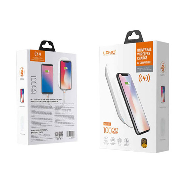 پاوربانک الدینیو PW1003 دارای طراحی بسیار زیبا و البته منحصر به فردیست که با ابعاد ۱۹x۷۴x۱۶۸ میلی متر و وزن ۲۳۸ گرم به راحتی قابل حمل است. این مدل جزو طراحی جدید این کمپانیست که قابلیت شارژ دستگاه های مختلف را به صورت بی سیم و باسیم دارد. با توجه به اینکه اکثر موبایل های هوشمند جدید به تکنولوژی شارژ وایرلس مجهز شده اند، الدینیو نیز این مدل را مجهز به قابلیت شارژ وایرلس نموده است. با توجه به اینکه موبایل ها در صورت شارژ شدن به صورت بیسیم ، به مدت زمان بیشتری برای فول شارژ شدن نیاز دارند و یا اینکه برخی موبایل ها از تکنولوژی شارژ بیسیم پشتیبانی نمی کنند ، پاوربانک بیسیم ldnio pw1003 قابلیت شارژ با سیم (شارژ از طریق کابل) را نیز برای این مدل در نظر گرفته است. پاوربانک بیسیم Ldnio PW1003 دارای یک پورت خروجی با ولتاژ 5.0 ولت و شدت جریان 2.1 آمپر است که توانایی شارژ سریع موبایل را نیز داراست. دارای نمایشگر LED میزان شارژ پاوربانک نشان می دهد .این پاور بانک دارای دو پورت ورودی است که یکی از آنها از نوع اندرویدی (MicroUSB) و دیگری از نوع اپل (Lightning) است تا شما بتوانید با همراه داشتن هرکابلی ، پاوربانکتان را شارژ نمایید.